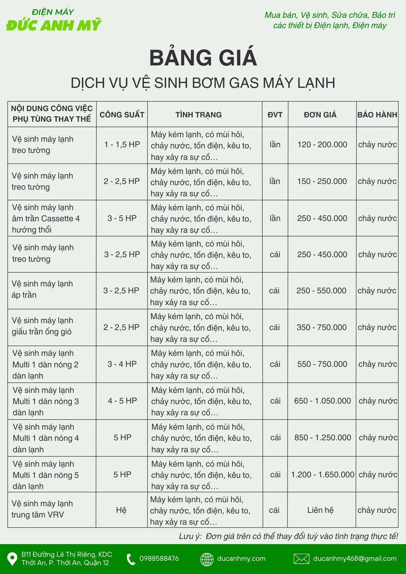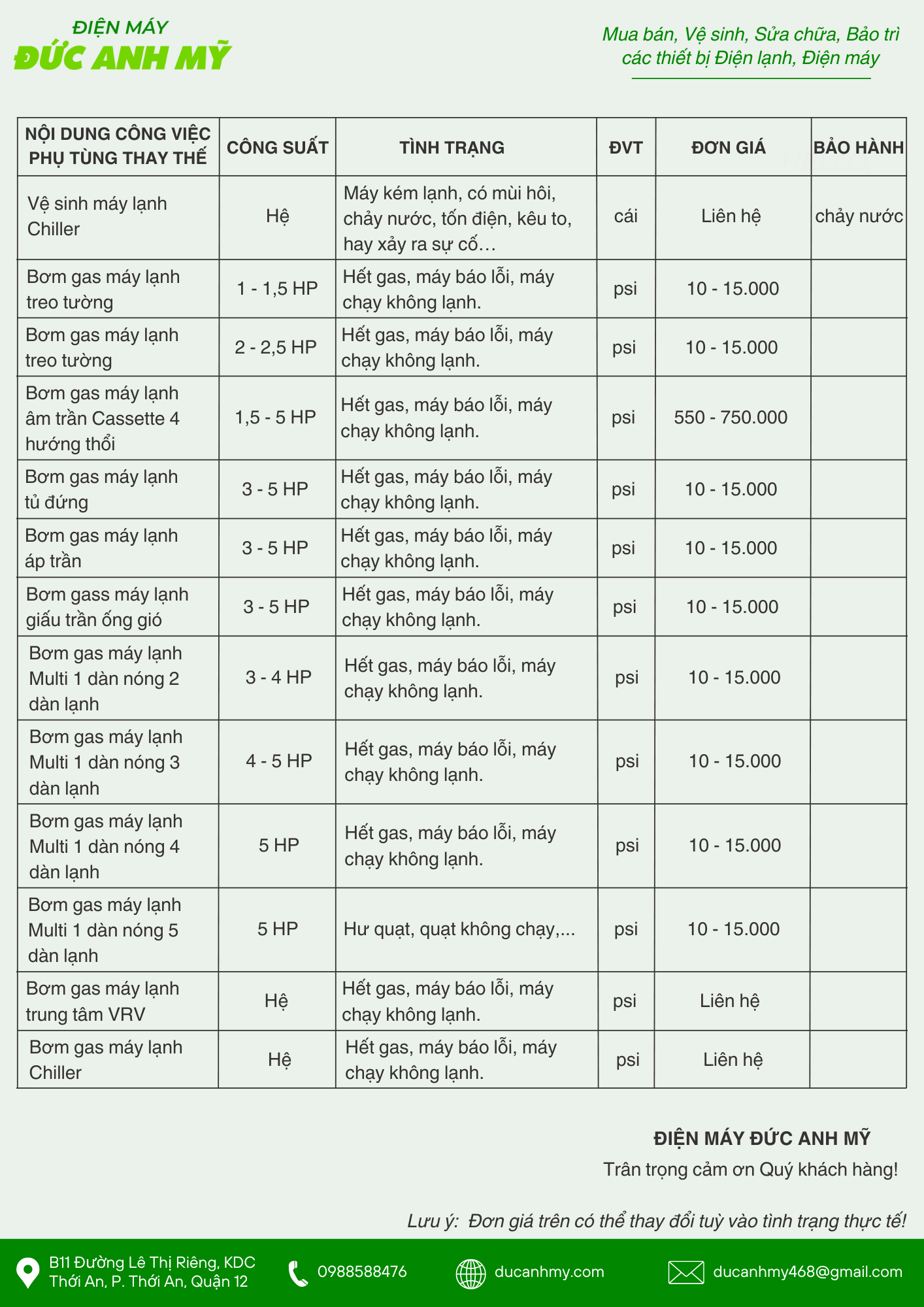Với mong muốn giúp quý khách hàng có thể dễ dàng nắm rõ chi phí dịch vụ bơm gas cho máy lạnh tại nhà chúng tôi xin gửi đến bảng giá dịch vụ chi tiết như sau: