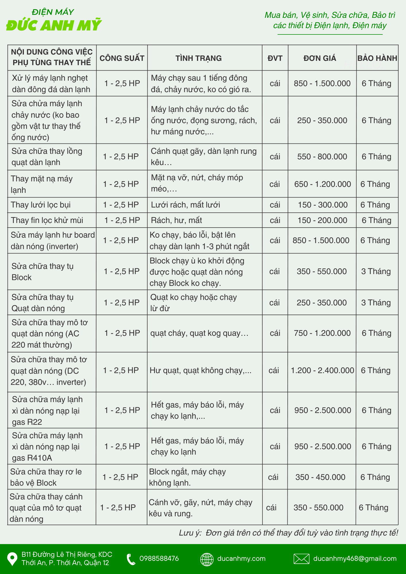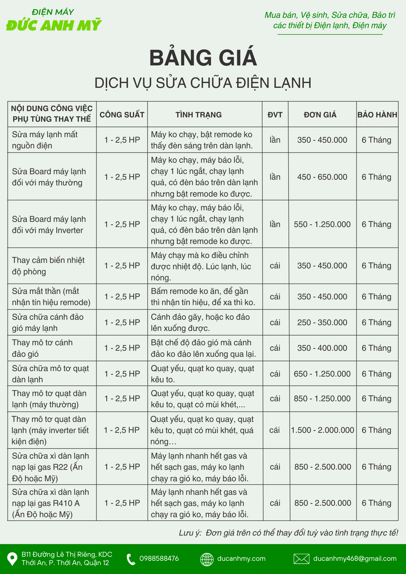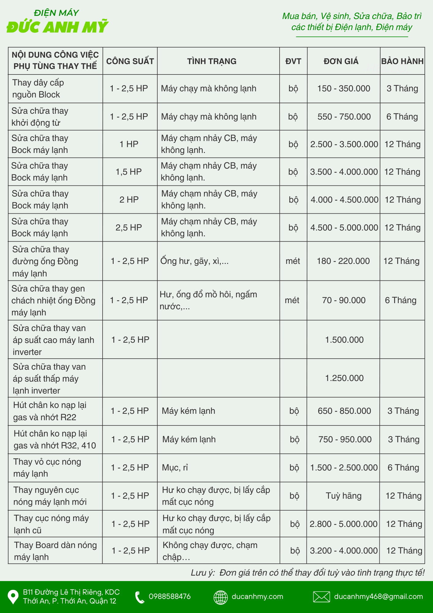 Với mong muốn giúp quý khách hàng có thể dễ dàng nắm rõ chi phí dịch vụ sửa máy lạnh tại nhà chúng tôi xin gửi đến bảng giá dịch vụ chi tiết như sau: