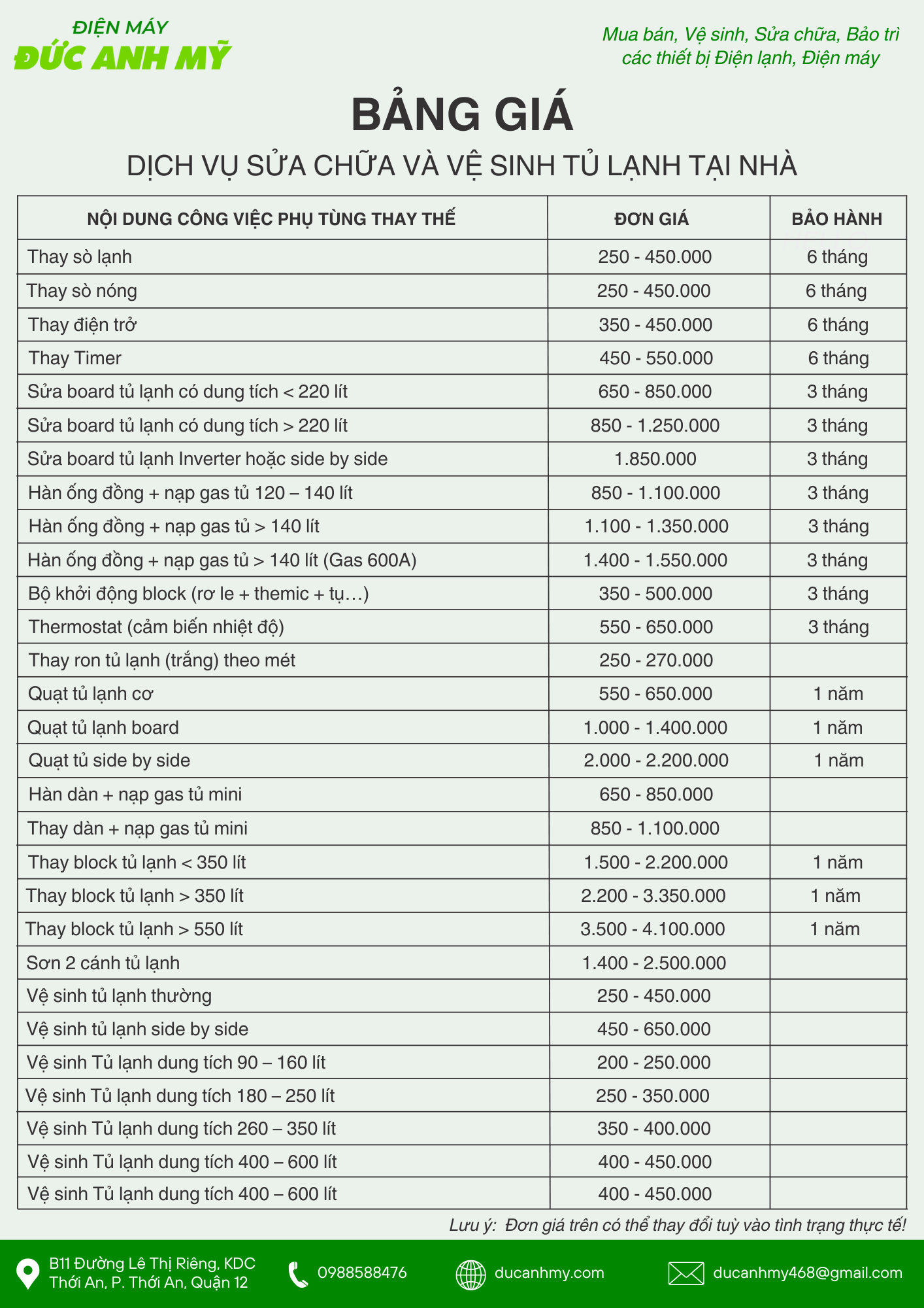 Với mong muốn giúp quý khách hàng có thể dễ dàng nắm rõ chi phí dịch vụ vệ sinh tủ lạnh tại nhà chúng tôi xin gửi đến bảng giá dịch vụ chi tiết như sau: